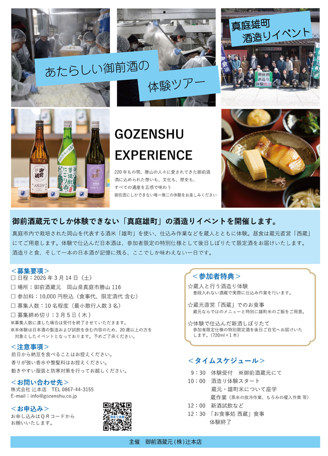 <募集要項> 日程 2026年3月14日(土) 場所 御前酒蔵元 岡山県真庭市勝山116 参加料 10,000円税込 (食事代、限定酒代含む) 募集人数 10名程度(最小敢行人数3名) 募集締め切り 2026年3月5日(木)