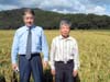 ▲収穫に期待をはせ、稲穂の前で思わず笑顔の辻社長(左)と杜氏。生産農家の方に感謝、感謝です
