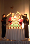 ▲シャンパンピラミッドならぬ、「日本酒ピラミッド」。会場のお客様の中から2名の方にご参加いただきました。